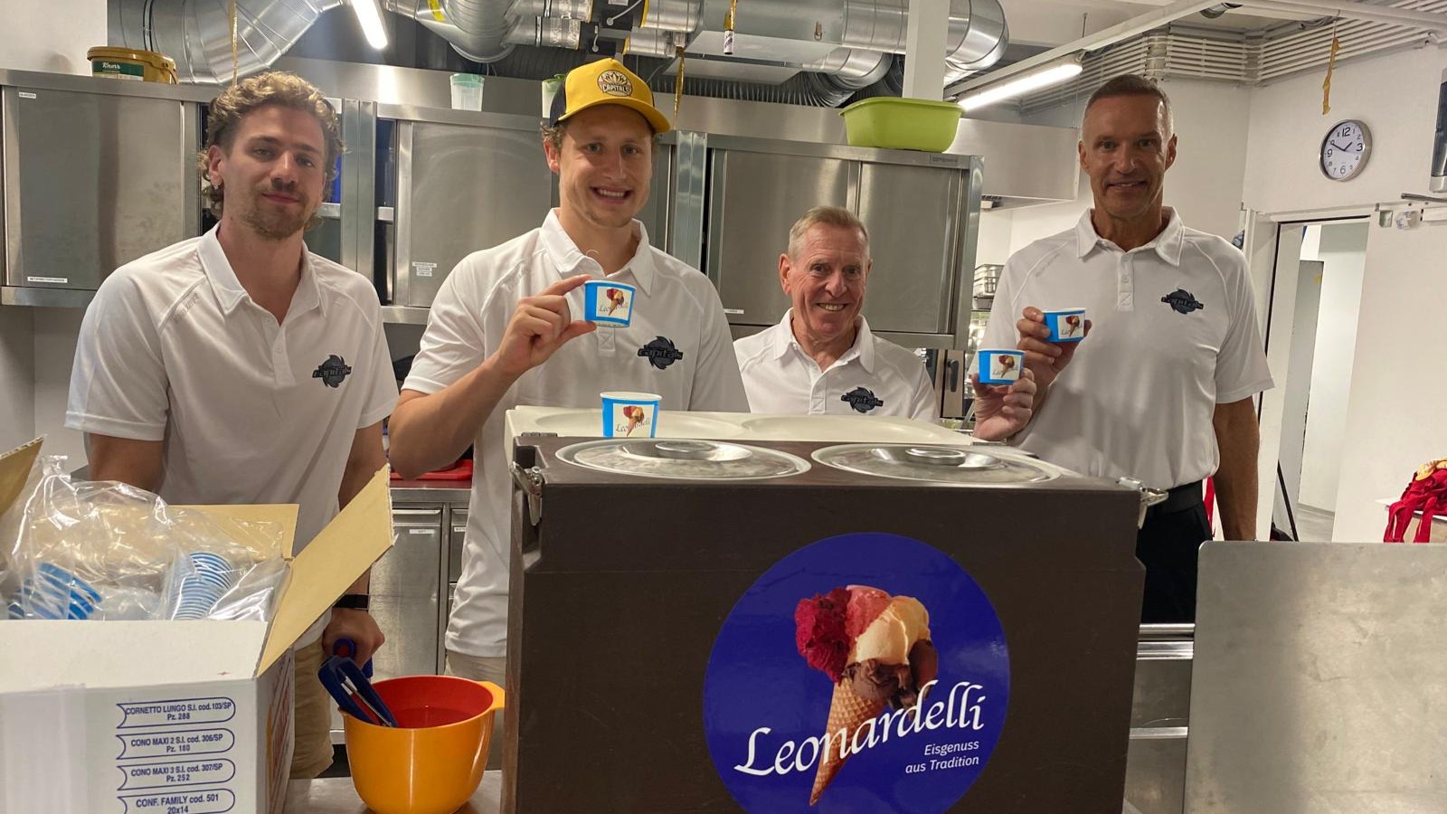 Der Sportliche Leiter der Vienna Capitals, Christian Dolezal, Head-Coach Gerry Fleming, Stürmer Armin Preiser und Neuzugang Sam Antonitsch zeigten gemeinsam mit Erwin Steiner, dem Charity-Beauftragten der Vienna Capitals, vollen Einsatz für die KlientInnen der karitativen Einrichtung im 22. Bezirk, dem Heimatbezirk des zweifachen Meisters. Die Caps-Delegation bereitete Faschierten Braten mit Kartoffelpüree und Tomatensalat zu. Als Nachspeise wurde köstliches Eis, das von Leonardelli La Gelateria zur Verfügung gestellt wurde, kredenzt. Den KlientInnen des Tageszentrums Nordlicht schmeckte das Mahl sichtlich.