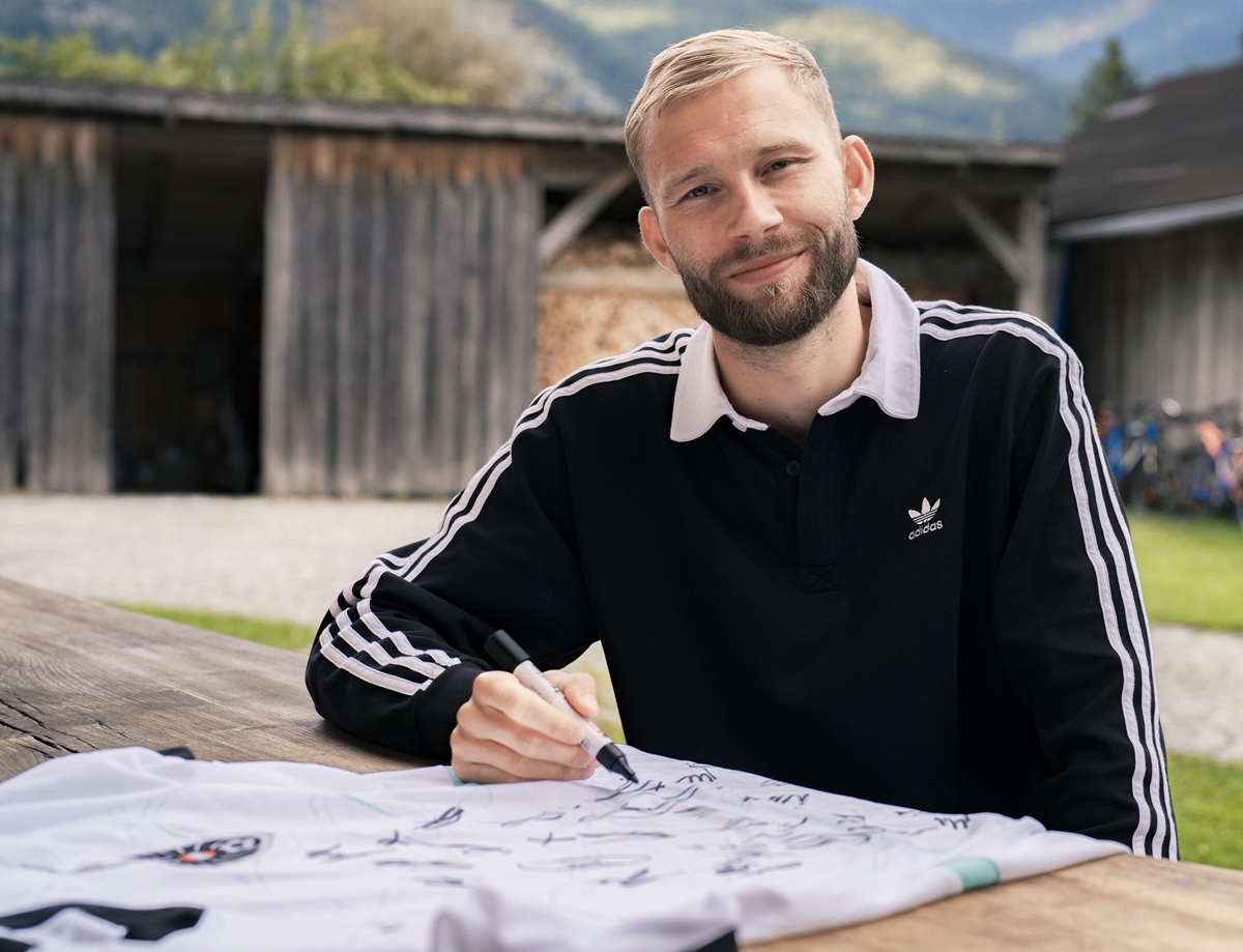 ÖFB-Teamspieler Konrad Laimer signiert das ÖFB-Trikot, (c) ServusTV / Manuel Seeger